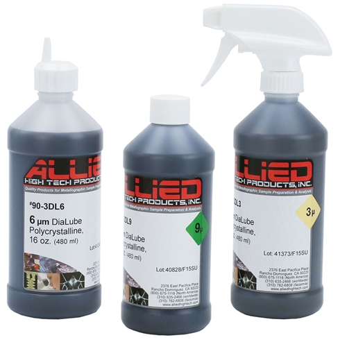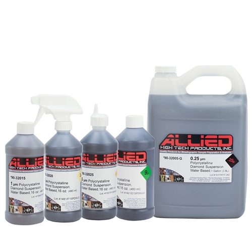 Allied的金剛石懸浮液是專門配制的以確保金剛石顆粒在穩(wěn)定的載體液中保持懸浮和分離。它們使金剛石容易、均勻的分布在拋光布或研磨盤表面。所有8和16盎司瓶都包含可翻瓶蓋和扳機(jī)式噴霧器用于噴出懸浮液。1加侖的包含有刻度線的16盎司空瓶以方便配藥。
