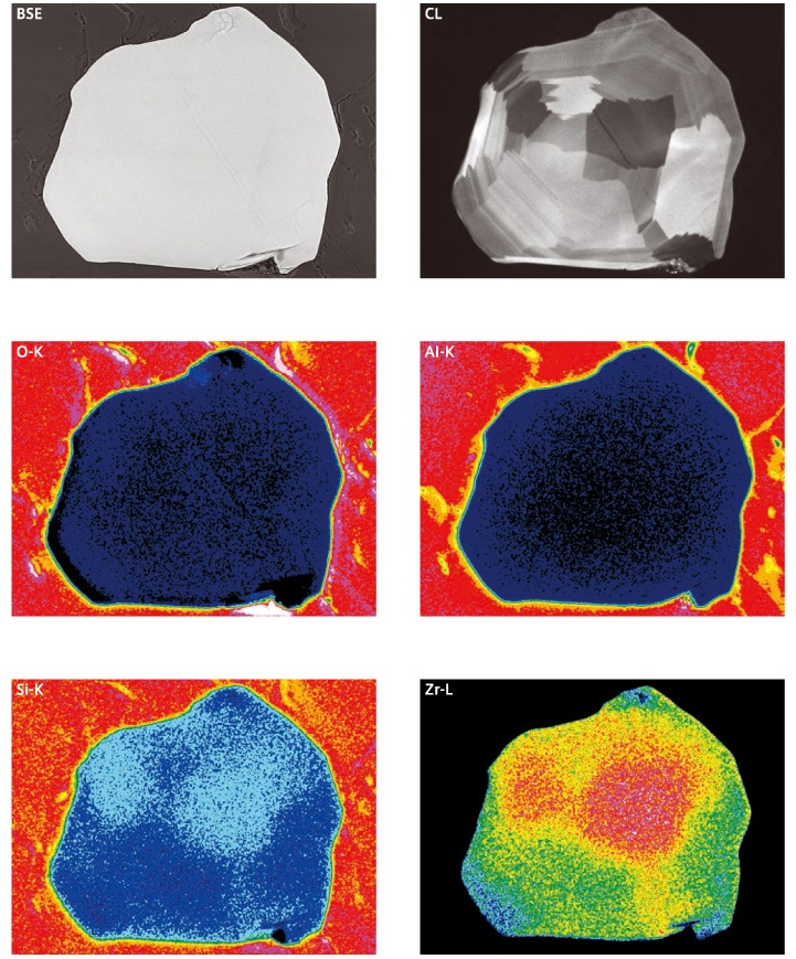 礦物的觀察分析案列顯示了鋯石晶體在相同視野下的觀察結果。在BSE圖像中很難看清鉻濃度的緩和偏差。但是,在CL圖像中可以確認到暗 色區域是對應于錯濃度較高的區域。